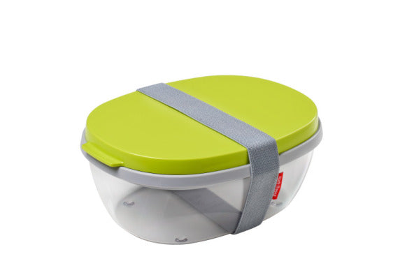 This salad box from Rosti Mepal can fit a main meal salad. The transparent box has a transparent lid and is large enough for tossing the salad before eating it. The compartment can be used for carrying bread or cutlery and the small mini box can be used to carry pine nuts or dressings. The salad box Ellipse is indestructible, leak proof and is dishwasher friendly.